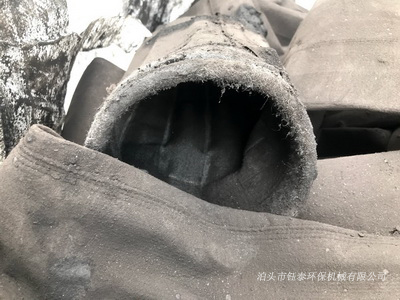除塵器使用地點:寧夏石嘴山,除塵濾袋使用壽命:3年,除塵濾袋規(guī)格:500g滌綸針刺氈,粉塵類型:黑砂,粉塵特性:粗粉塵、濕度大,干燥時會變成固體并粉碎,工作溫度:低于60℃除塵器吸風口處有一個除塵濾袋在袋口損壞,濾布完全成了黑色,由于缺少一個濾袋