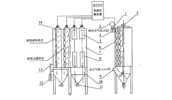 反吹空氣通過電動三通閥進入箱體后,與過濾狀態(tài)相比反向通過濾袋,與此同時,高頻電振器開始動作,使濾袋隨這作高頻震動。在反吹及高頻振動的同時作用下起到清灰的效果(清灰時間是可調的)。清灰結束時高頻電振停止振動。電動三通閥主閥板打開,付閥同時關閉,又恢復了正常過濾狀態(tài)。可以按照需要調整清灰的相鄰間隔時間、使各箱體按指定的時間依次序進行清灰。