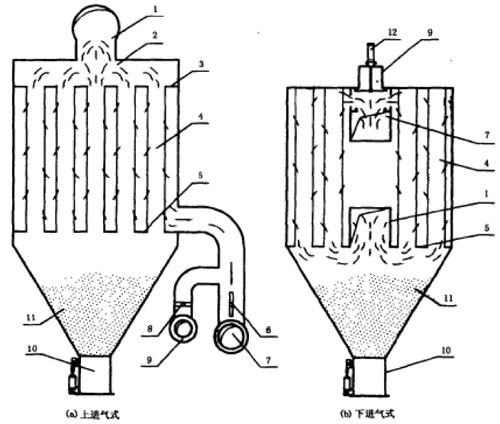 當除塵器運行阻力到一定值后,需對濾袋清灰。清灰工作狀態(tài),如圖8-3a所示。其工作過程如下:當提升切換閥向下運動,閥板在將出風口關閉的同時打開反吹風口和截止閥,由于反吹風機鼓入的氣流是與過濾氣流方向相反的逆氣流,改變了濾袋內(nèi)外的壓差,使濾袋由“膨脹”變“縮癟”狀態(tài),剝離濾袋內(nèi)表面附著的粉塵層。提升切換閥向上運動,閥板在將出風口打開的同時關閉反吹風口和截止閥,除塵濾袋重新“膨脹”,除塵器恢復到正常過濾狀態(tài)。