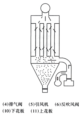 該除塵設(shè)備由含塵氣體入口至凈化煙氣出口,本體結(jié)構(gòu)由進(jìn)氣管路、進(jìn)氣室、袋室、灰斗、排灰閥、出口管道及反吹風(fēng)系統(tǒng)和清灰控制系統(tǒng)所組成。