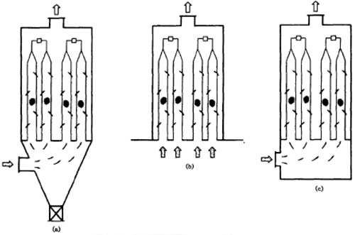 濾袋一般采用729滌綸除塵布袋或滌綸針刺氈,縫制成三袋聯(lián)體袋(也稱三聯(lián)袋),底部縫有彈性環(huán)使其能直接卡入花板孔中,頂部縫有相同材料的掛帶使其能將濾袋張緊和吊掛在搖桿上(見圖7-3)。過濾形式為內(nèi)濾式。工作時(shí)含塵氣體由濾袋下口進(jìn)入內(nèi)部;過濾后的清潔氣體經(jīng)袋室由排風(fēng)機(jī)排入大氣,清灰時(shí)先停止過濾工作,再啟動搖動清灰機(jī)構(gòu)進(jìn)行清灰。