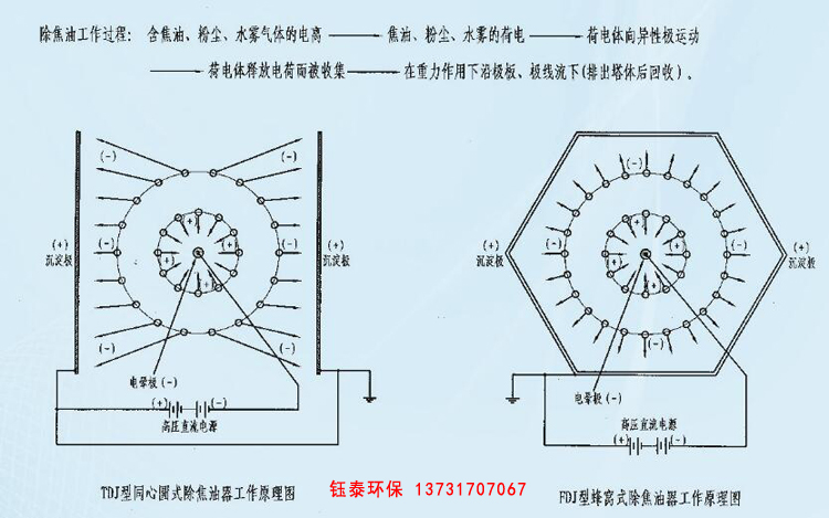 當(dāng)沉淀極內(nèi)含有焦油、水霧、粉塵等混合物的煤氣通過時(shí),移動(dòng)中的離子、電子與焦油、水霧、粉塵等粒子在碰撞、摩擦過程中被強(qiáng)制荷電。由于電離僅僅發(fā)生在距負(fù)極距離較小的強(qiáng)電場區(qū)域內(nèi),故帶有正電荷的離子很容易被負(fù)極吸引而流向電暈極,正離子流通截面僅占整個(gè)極間空間很少一部分; 而被加速的自由電子不僅數(shù)量大,而且要通過整個(gè)極間空間流向正極,電子流通截面要占去兩極間空間99%以上的面積,故煤氣中的焦油、水霧、粉塵絕大部分帶負(fù)電而流向沉淀極(正極),并吸附在該極板上;而帶正電的焦油混合物被電暈極(負(fù)極)吸附在極線上;中和后被收集的焦油混合物在自身重力作用下,沿極板、極線流下(排出塔體后回收)。