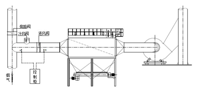 煙氣溫度一旦高于除塵器正常使用溫度,自動(dòng)控溫裝置啟動(dòng)冷風(fēng)閥,放進(jìn)冷風(fēng),同時(shí)電鈴自動(dòng)報(bào)警,提示操作工采取降溫措施;當(dāng)煙氣溫度降至正常使用溫度時(shí),冷風(fēng)閥自動(dòng)關(guān)閉,操作也恢復(fù)正常;當(dāng)采取放冷風(fēng)后,煙氣溫度仍超過除塵器的允許O高溫度時(shí),進(jìn)風(fēng)閥會(huì)自動(dòng)關(guān)閉,旁路閥打開,煙氣進(jìn)入旁路煙道排空,確保除塵器的安全運(yùn)行。