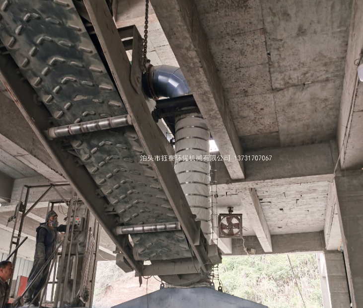 根據(jù)袋水泥裝車機生產(chǎn)工藝要求,需要膠帶機前后運行,設計在移動膠帶機車的尾部安裝一臺固定收塵集箱,集箱一側(cè)出口連接500mmX500mm可伸縮移動管道,一般可移動伸縮8m長度,把可移動吸塵罩收集的粉塵氣體通過此移動管路輸送到固定管路,再由固定管路將粉塵氣體輸送到除塵器內(nèi)進行凈化處理,移動管路內(nèi)部安裝多個滾輪軸承,每節(jié)移動管路上都設有法蘭油浸羊毛氈做為密封,可滿足袋水泥裝車機前后移動運行的要求。