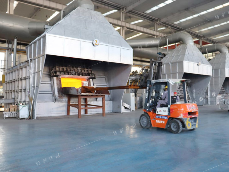 再生鋁雙室爐煙氣處理系統(tǒng)采用XLP高效旋風(fēng)除塵器+強(qiáng)制排風(fēng)冷卻器+脈沖布袋除塵器組成,雙室爐爐門排煙采用2個(gè)排煙罩,2個(gè)爐門罩交替打開;并配套爐膛排料輔助排煙系統(tǒng),1套雙室爐煙氣處理系統(tǒng)處理風(fēng)量≥130000m3/h。除塵器運(yùn)行后將雙室爐燃燒過(guò)程產(chǎn)生的高溫?zé)煔猓囟龋?50℃)和爐門罩排出的煙氣全部收集干凈,保證了工人的操作環(huán)境,達(dá)到了規(guī)定的排放標(biāo)準(zhǔn),給生產(chǎn)企業(yè)帶來(lái)了巨大的經(jīng)濟(jì)效益。除塵器收集的顆粒污染物主要是熔煉過(guò)程中產(chǎn)生的金屬氧化物和非金屬氧化物,還有大量碳?;曳莸龋龎m脫硫后:煙塵濃度:≤10mg/m3。